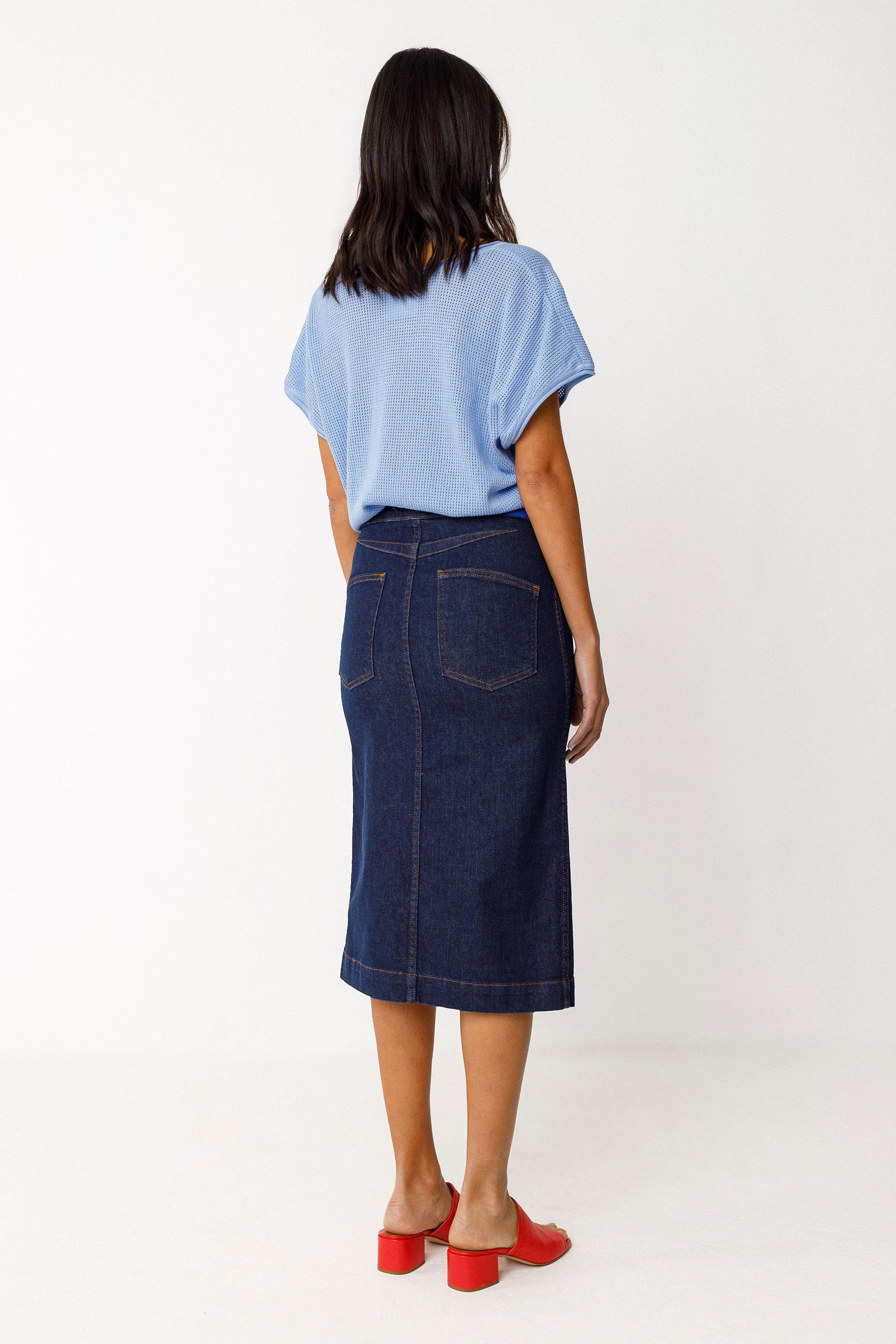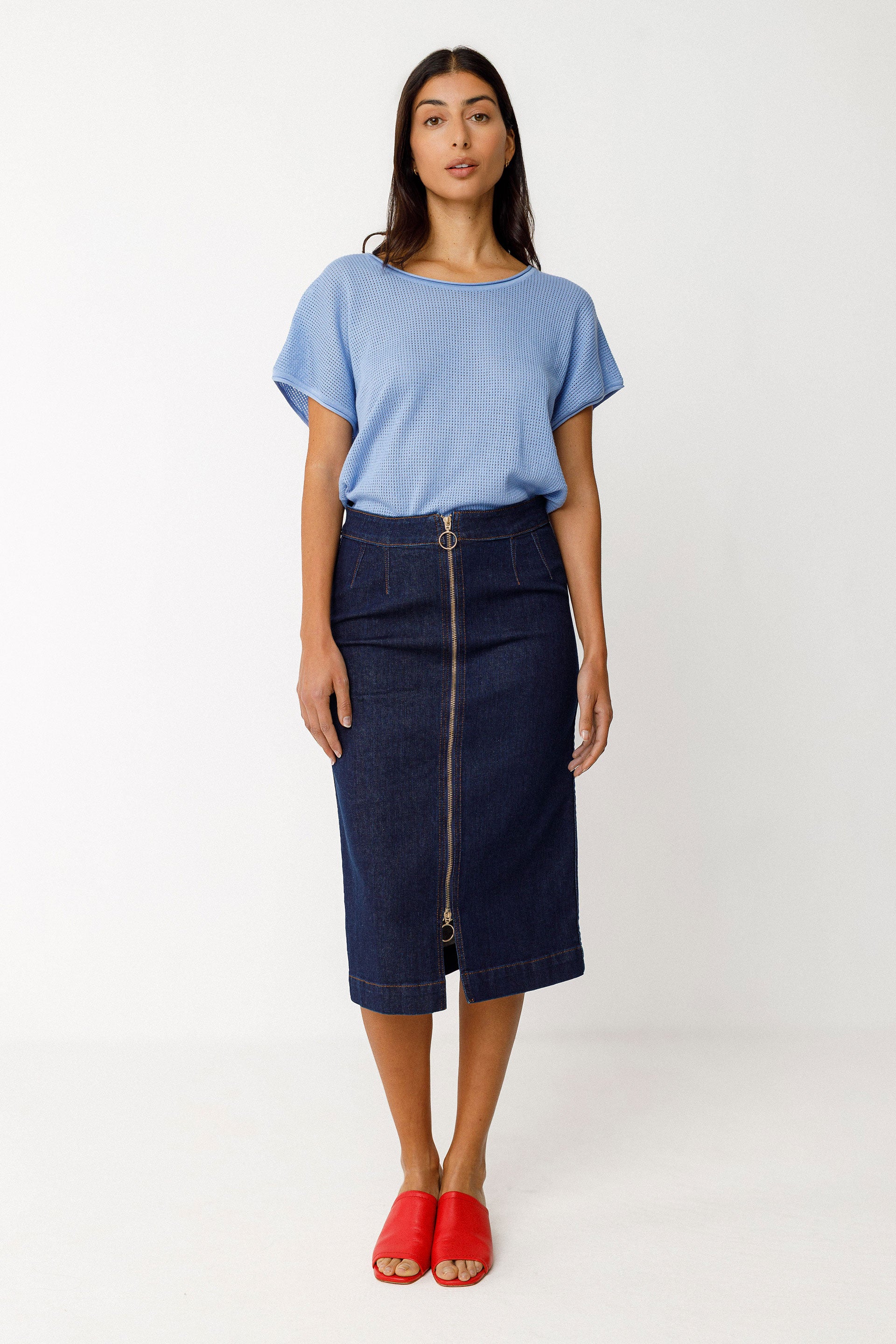 Leichtes, strukturiertes Strickoberteil mit Rundhalsausschnitt. Es hat überschnittene Schultern und einen gerippten Saum.